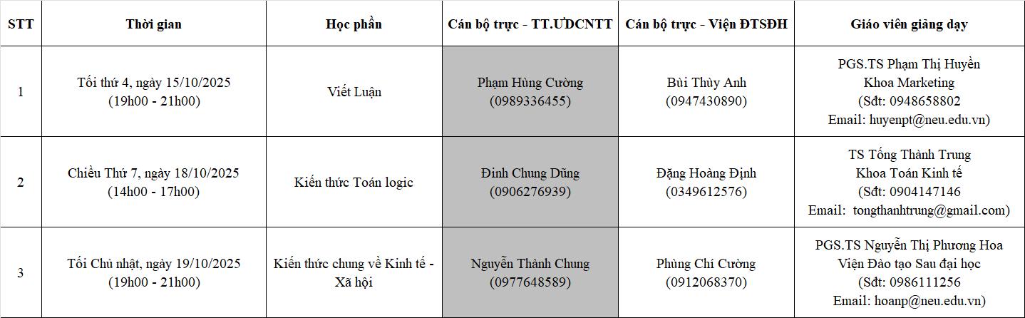 Đáp ứng nhu cầu của thí sinh chuẩn bị thi tuyển sinh thạc sĩ đợt 2 năm 2025, Đại học KTQD tổ chức 3 buổi hướng dẫn ôn tập môn Luận, Kiến thức kinh tế tổng hợp với thông tin cụ thể như sau: